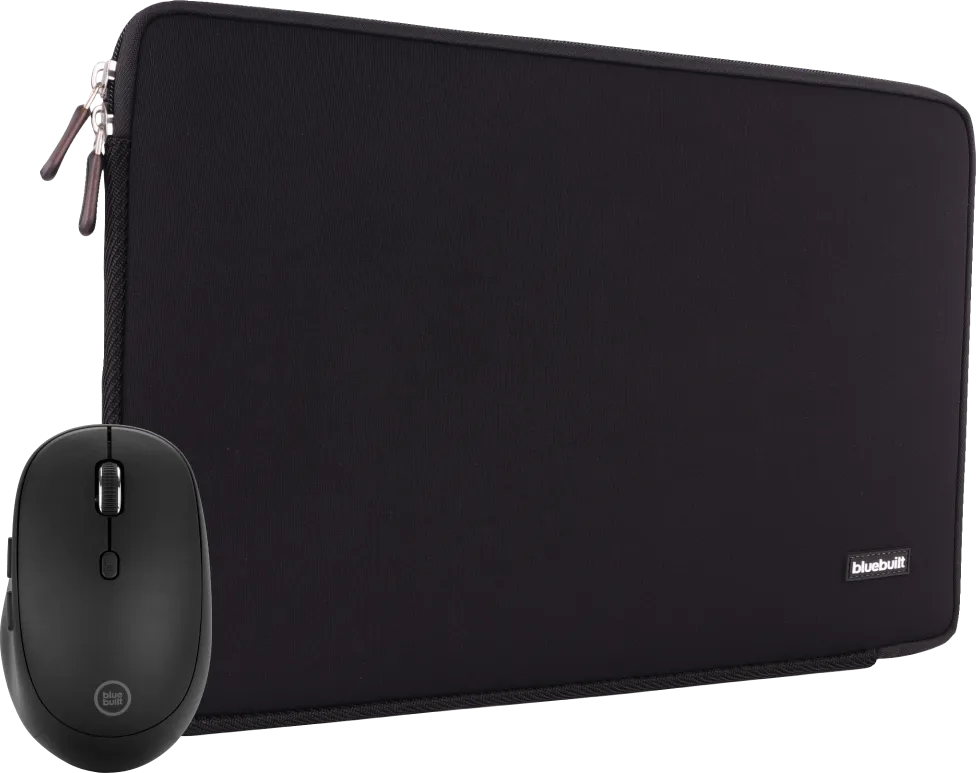 Met de BlueBuilt Laptophoes voor Apple MacBook Air 15 inch Zwart + Tradendum Muis bundel neem je jouw MacBook veilig mee en klik je soepel door je documenten. De hoes beschermt jouw MacBook tegen krassen, stoten en beschadigingen. Je neemt je 15 inch Apple MacBook Air veilig mee in je tas door deze stoffen sleeve met gevoerde binnenkant. Heb je haast en wil je snel je MacBook uit je tas pakken? Door de dubbele ritssluiting pak je jouw MacBook gemakkelijk uit de hoes. Je laat de hoes hierbij gerust in de tas zitten. Verder scrol je soepel door je documenten met de Tradendum muis. Je koppelt de muis via bluetooth met je MacBook en navigeert snel tussen pagina’s door de 2 duimknoppen. Door de lasersensor gebruik je de muis op elke ondergrond, dus ook op een glazen tafel. De binnenmaten van deze laptophoes zijn 2 x 34,5 x 24 cm. Let op: deze hoes past alleen om 15 inch Apple MacBook Air modellen.